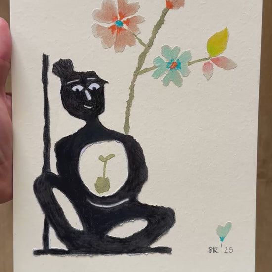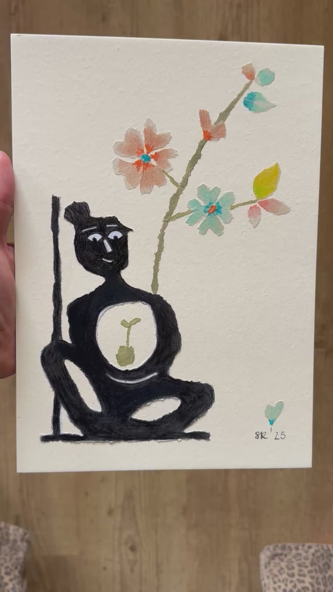 Enerzijds kun je het opvatten als oogsten wat je zaait maar meer en vooral toch ook je eigen donkerte/diepte/schaduwen/angsten aan durven kijken. Door het figuur helemaal donker te maken wordt dit aspect benadrukt.