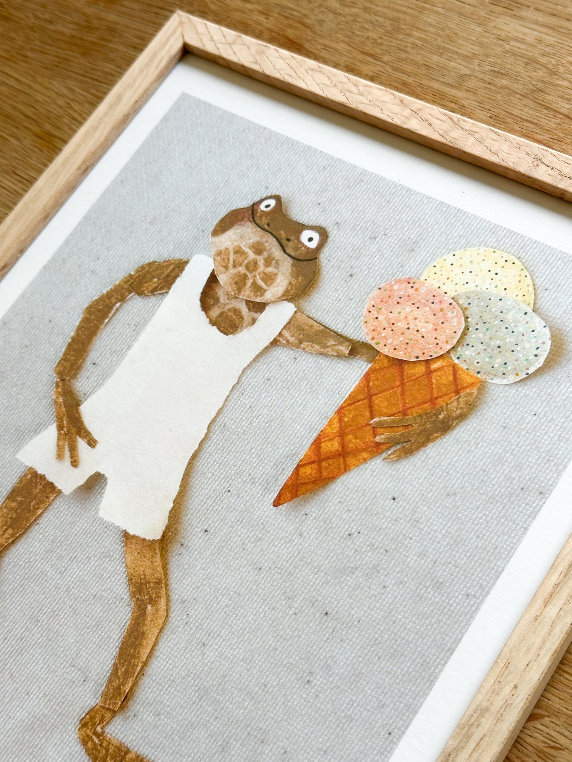 Ik maakte de illustratie op papier met oliepastelkrijt en potlood, en knipte dit uit. Ik verwerkte deze vervolgens digitaal om zo deze een frogalicious serie te maken.