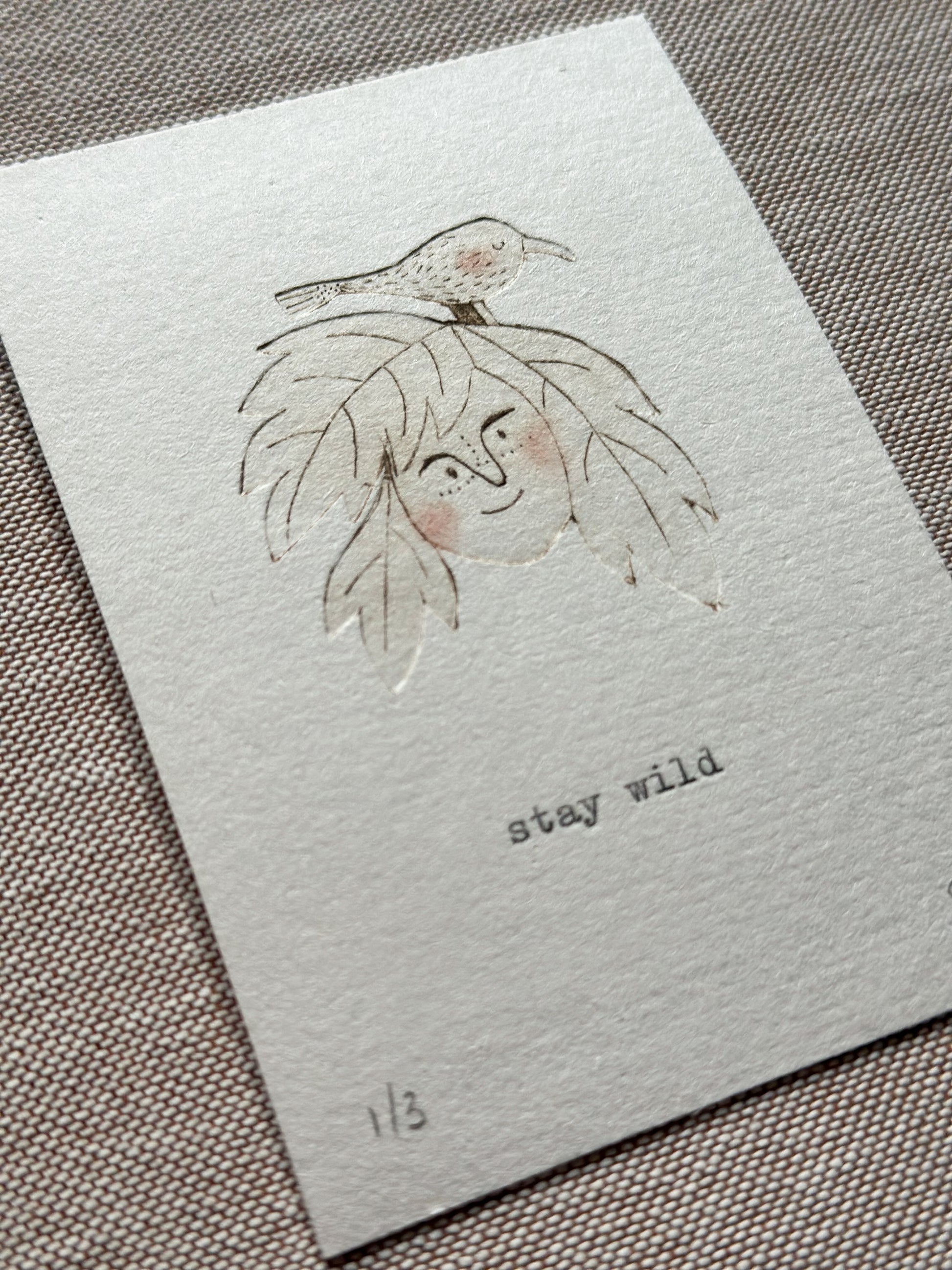 Toen ik deze print maakte wilde ik het een titel meegeven. ‘Stay wild’ kwam naar boven.
