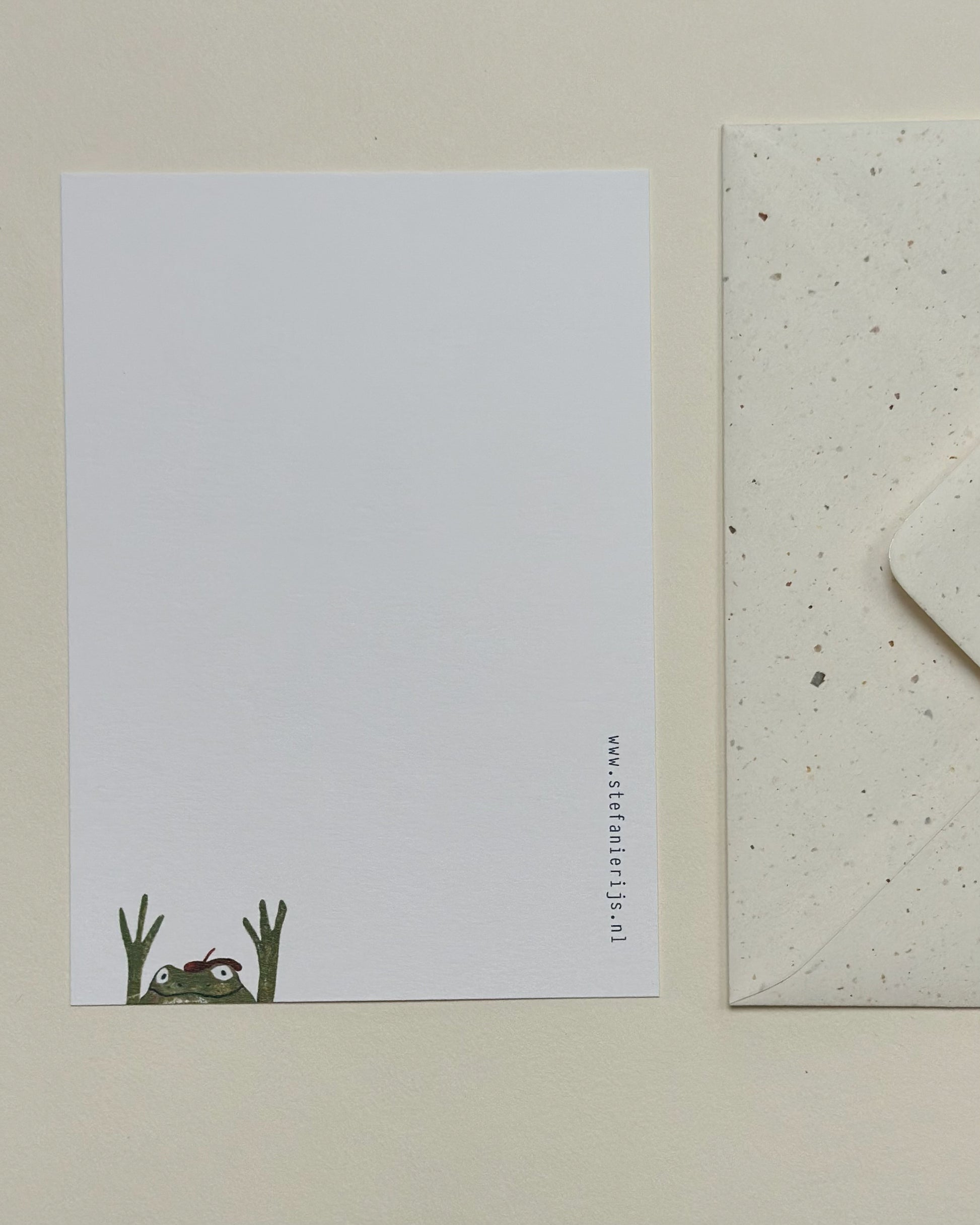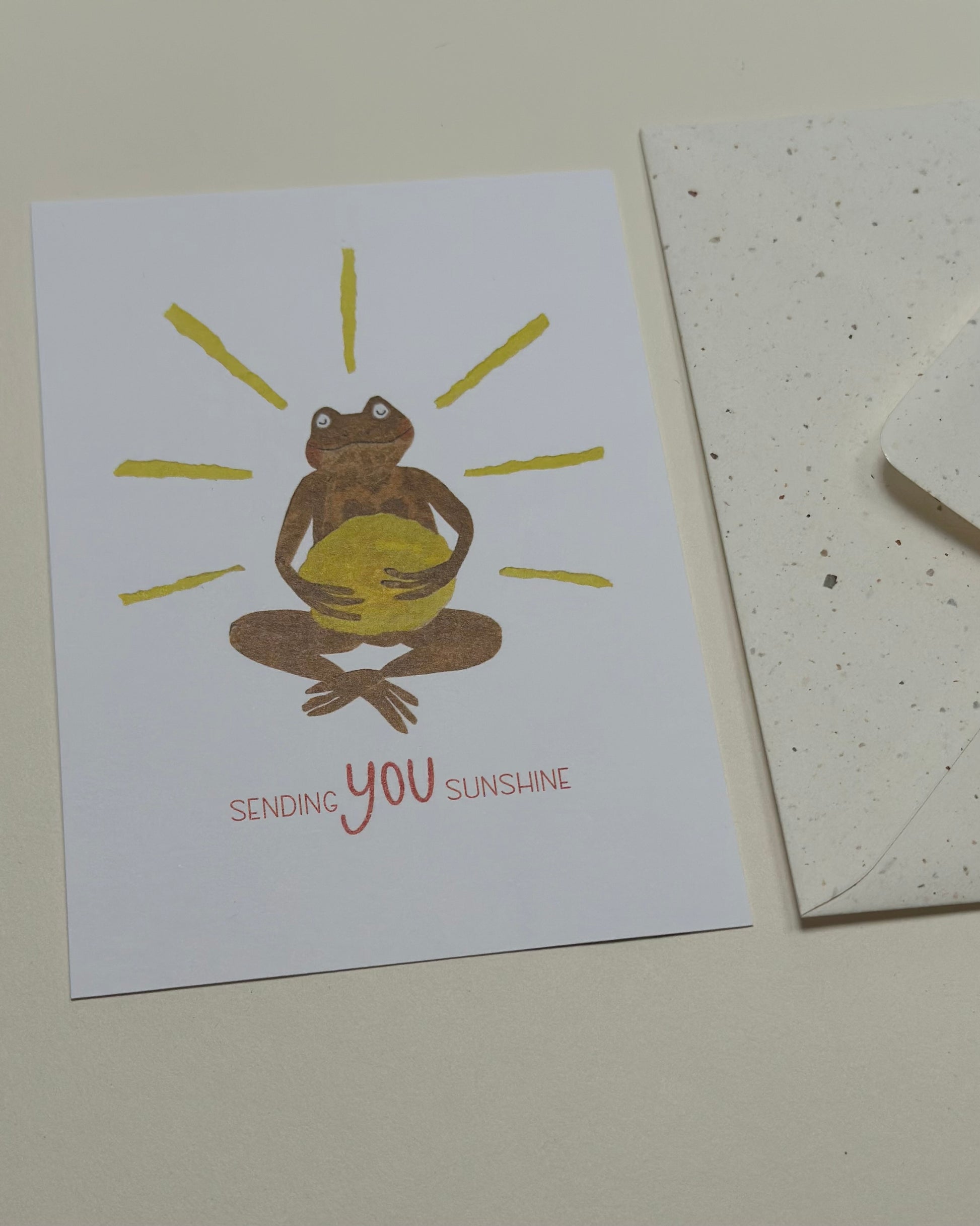 Een kikker die wat zonneschijn toestuurt: kaarten die altijd handig zijn om in huis te hebben maar ook heel leuk zijn om in te lijsten.