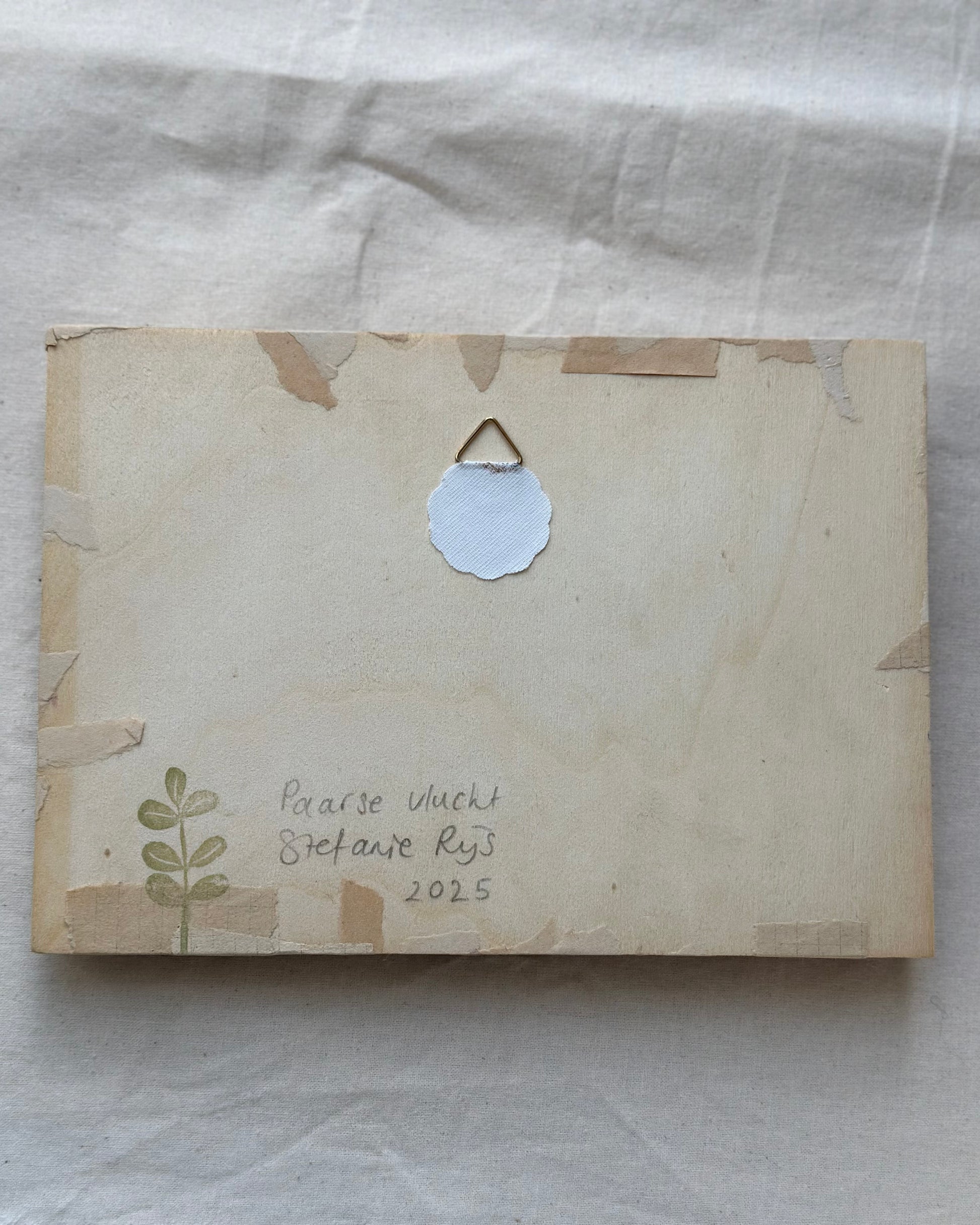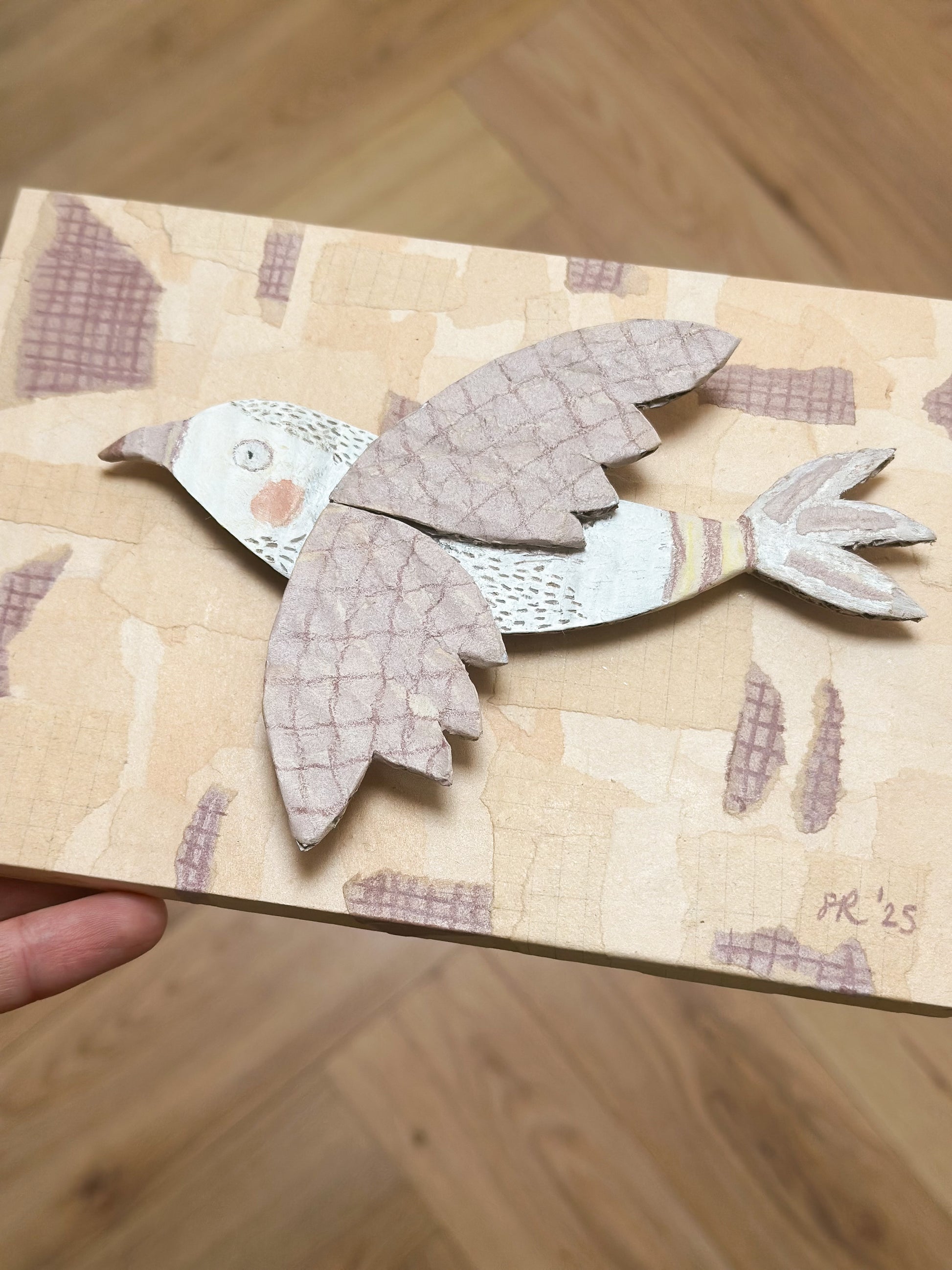 Deze lila paarse teint combineert prachtig met de vergeelde teinten van het oude papier. De vogel is op het houten paneel geplakt en geeft een leuk effect door die verhoging.