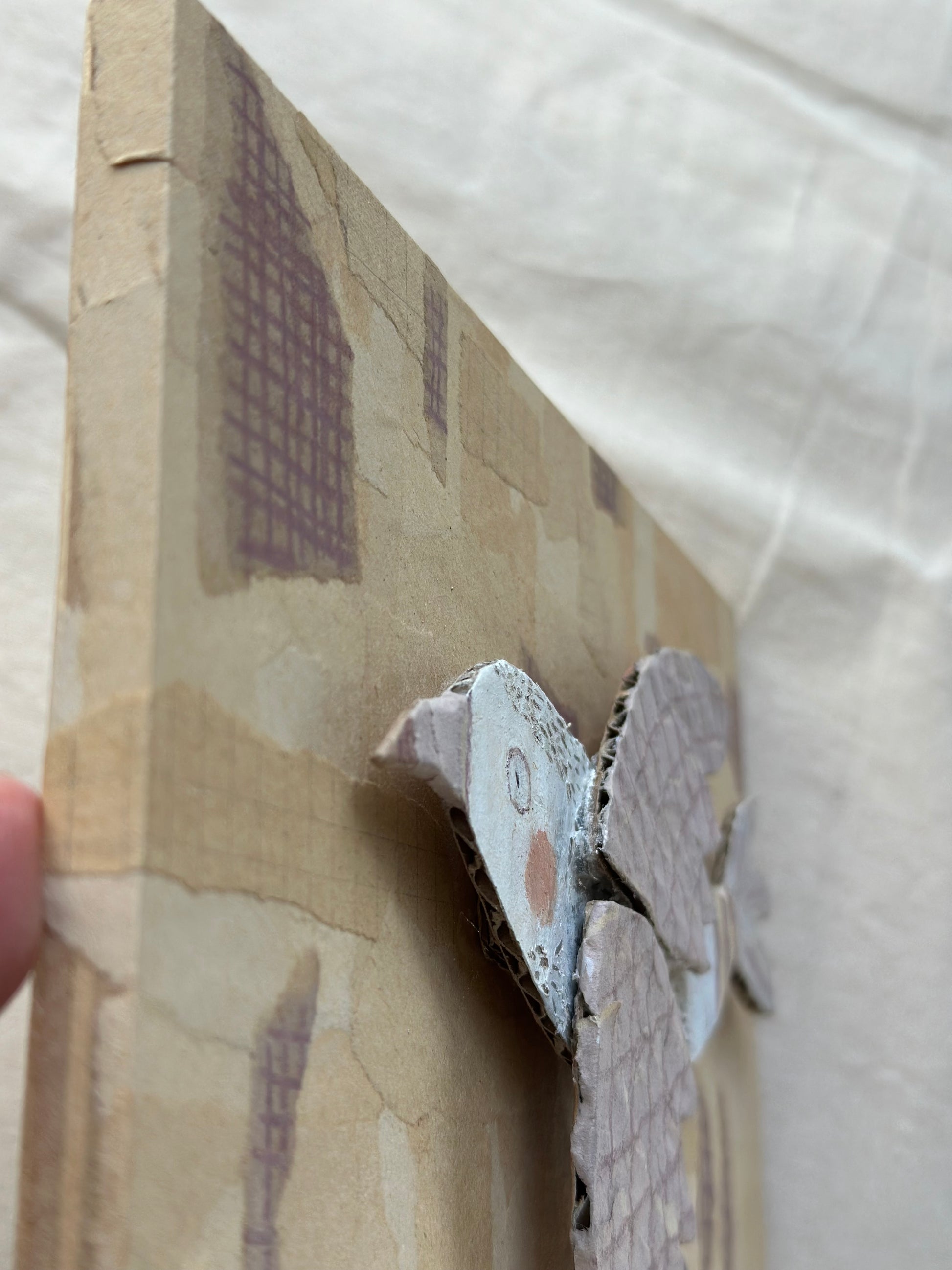 Houten MDF paneel bedekt met vintage papier en kleur gegeven met potlood inkt en oliepastelkrijt.